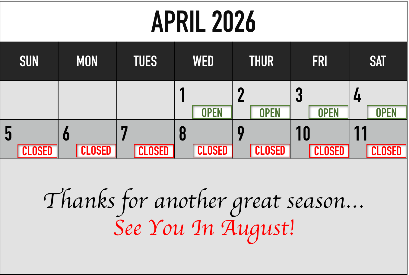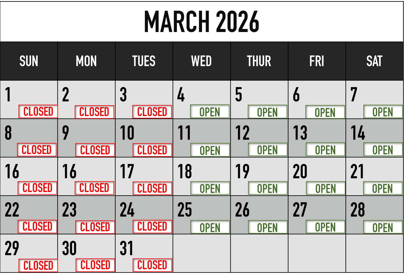 Sunday: CLOSED